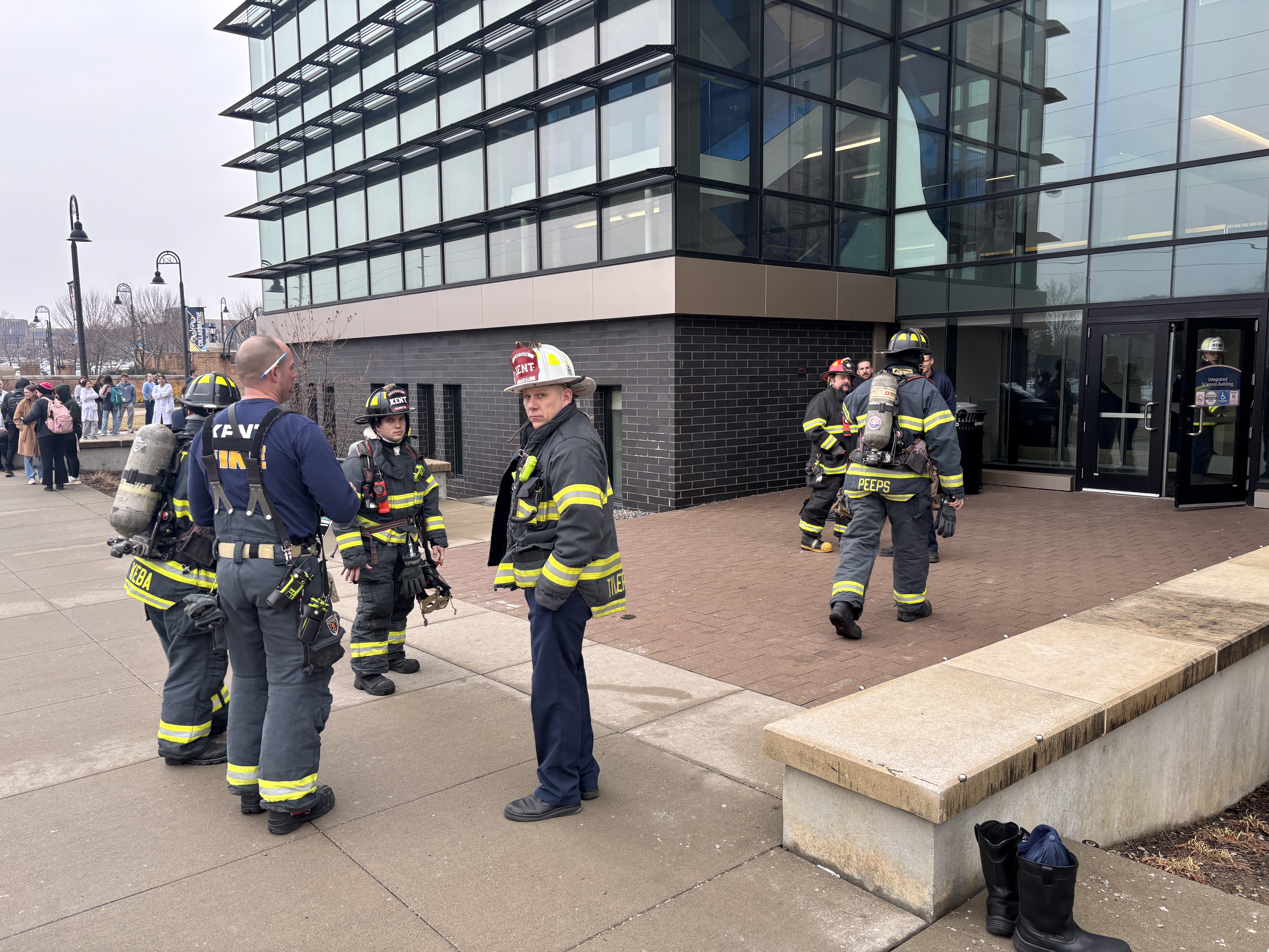 Several dozen students and staff were evacuated Tuesday afternoon from the Integrated Science Building along Summit Street on the Kent Campus following a problem with a liquid nitrogen tank in a student lab.